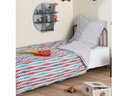 Un diseño fresco y moderno que añade un toque vibrante y contemporáneo a la habitación infantil. La funda es reversible, con un patrón gráfico en colores como turquesa, rojo y azul en un lado, y un estampado más discreto en el reverso, ideal para revitalizar el ambiente de forma sencilla.