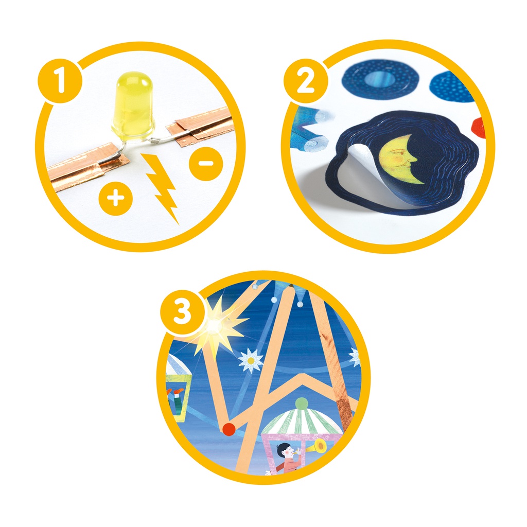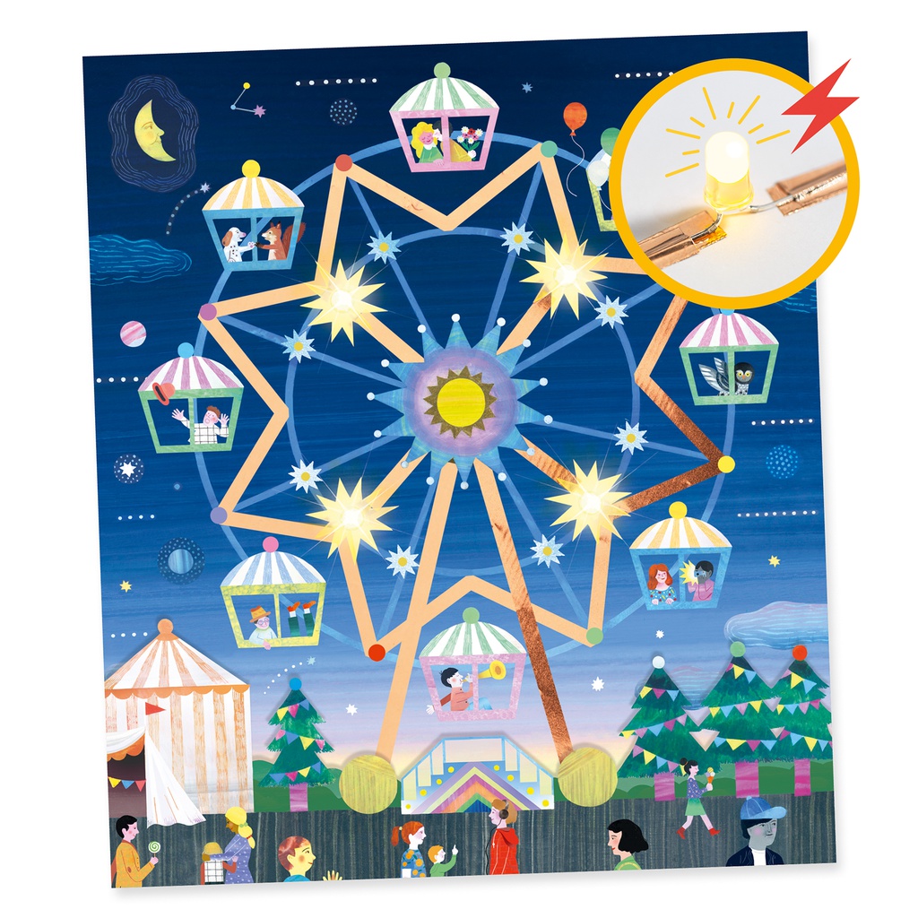 Factory, una gama para aprender sobre la tecnología a través de pasatiempos creativos. Un cofre con el que se pueden hacer tres bonitos cuadros de parques de atracciones que se iluminan. Con el adhesivo conductor, se trazan los circuitos eléctricos y luego incorpora la pila y los LED siguiendo los pasos descritos en el folleto. Después, personaliza sus creaciones con los numerosos accesorios incluidos. ¡Es mágico! Al hacer contacto, los cuadros se iluminan y se vuelven interactivos gracias al ingenioso sistema de interruptores. ¡Una vez dominada la técnica, se lanzan a la experimentación imaginando su circuito en el tablero adicional incluido en este kit!