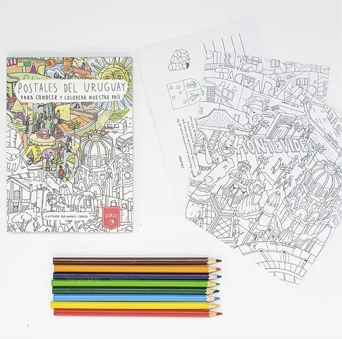 El Block Postales del Uruguay – Pika es un set de 19 postales de 13 × 18 cm en blanco y negro listas para colorear, cada una representando un departamento uruguayo con elementos culturales e históricos. En su reverso incluye ilustraciones informativas, escudo y espacio para escribir. Ideal para aprender sobre el país, compartir creaciones por correo o enmarcar como arte. Es un producto educativo, creativo y 100 % diseñado y producido en Uruguay